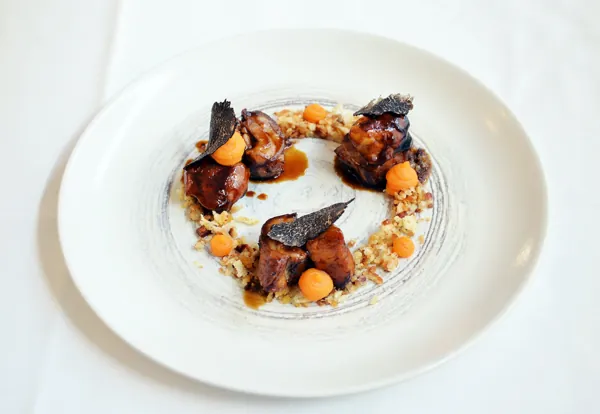 Su plato: cuellos de ternasco, lechecillas glaseadas, migas de pastor, boniato y trufa de Graus.