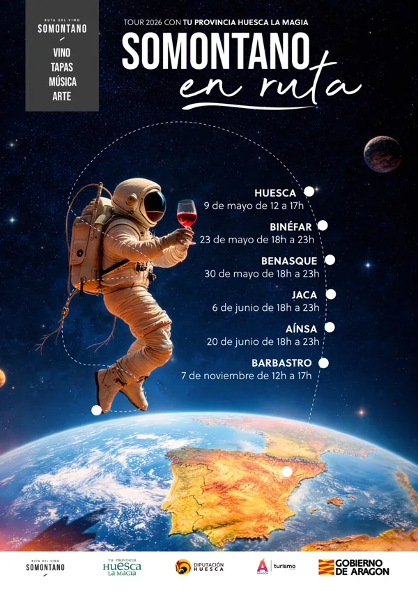 Somontano en Ruta 2026 celebrará su cuarta edición con seis paradas en el Alto Aragón. La gira comenzará el 9 de mayo en Huesca y terminará el 7 de noviembre en Barbastro, coincidiendo con el Día Mundial del Enoturismo. En cada cita habrá vinos de la Ruta del Vino Somontano, tapas de hostelería local, música y arte sobre barrica en directo.